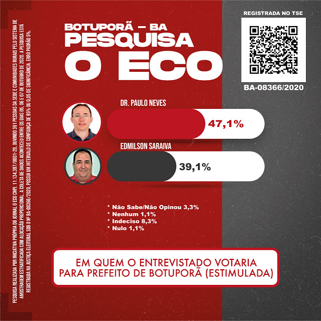 Um novo levantamento estatístico realizado por iniciativa própria do Jornal O Eco em Botuporã, indica que ainda persiste a indefinição no que diz respeito à intenção de votos para prefeito no pleito de 15 de novembro próximo. Desde que se definiu o cenário e as chapas, O Eco vem monitorando o município e constata que o pleito eleitoral mais uma vez será acirrado, uma vez que as oscilações entre as pesquisas são mínimas, com ligeira vantagem para Dr. Paulo Neves. O médico segue liderando com 47,1% das intenções de voto, enquanto o segundo colocado professor Edimilson Saraiva pontuou com 39,1%.